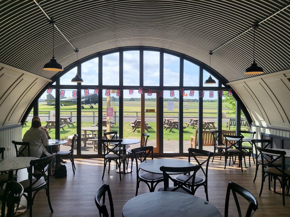 Great on a sunny day when there is air activity. Good basic menu and plenty of seating to allow viewing of the taxiway and runway. Great atmospheric recreation of a WWII NAFFI and / or Squadron readiness room. Loads of interesting aviation photos on the walls.